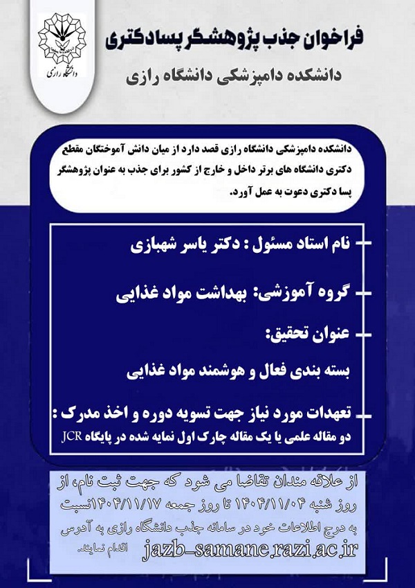 دانشگاه رازی از میان دانش آموختگان شاخص و ممتاز مقطع دکتری داخل یا خارج کشور غیرشاغل و علاقمند به شرکت در دوره پسادکتری برای نیمسال دوم سال تحصیلی 1405 - 1404 پژوهشگر میپذیرد.